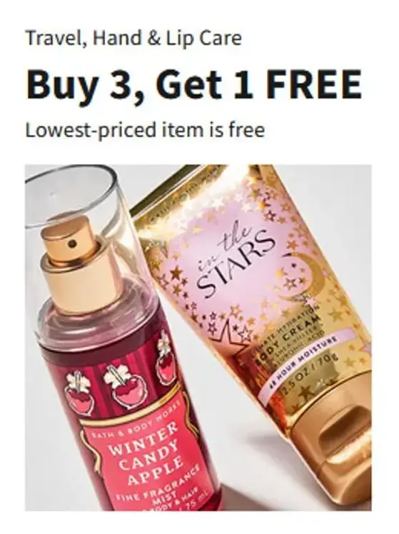 Get it while it lasts! Shop in store and get travel, hand & lip care for buy 3, get 1 free.