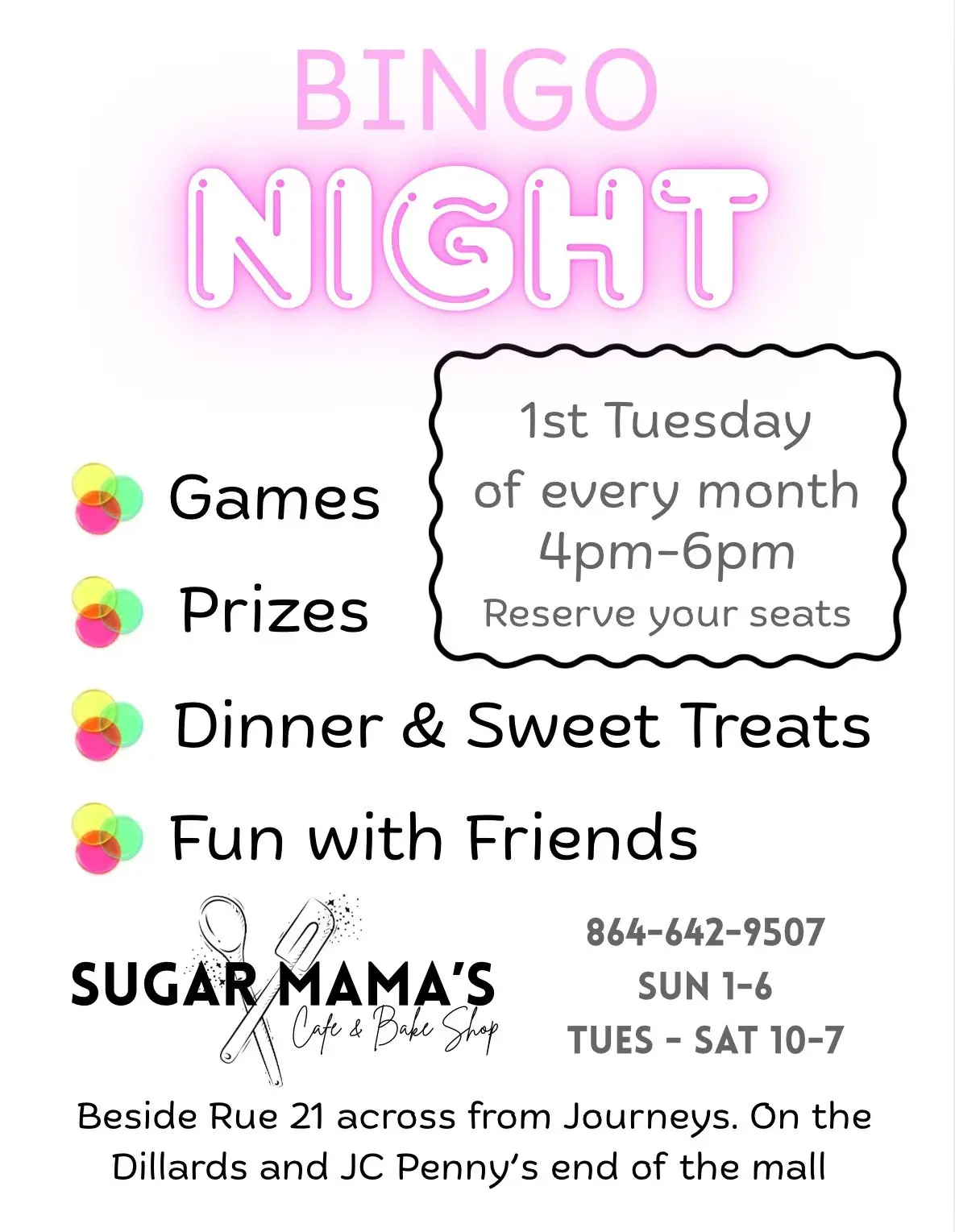 Sugar Mama’s Bakery is hosting a Family Fun Bingo Night, FREE for all ages! Bring the whole family and enjoy an evening of games, prizes, and lots of fun with friends. Dinner and sweet treats will be available for purchase.