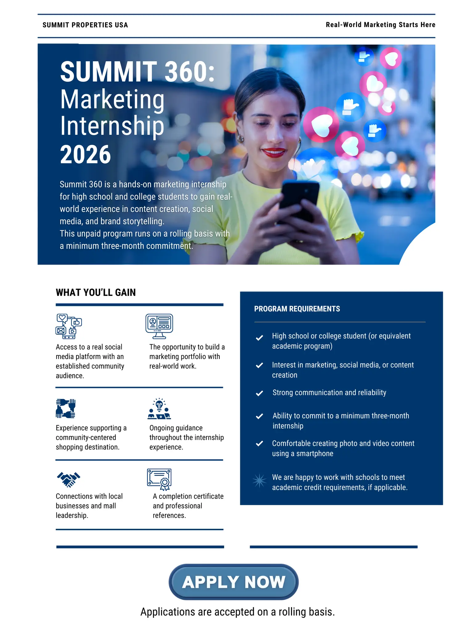 The Summit 360 Marketing Internship is open to high school and college students who are interested in marketing, social media, content creation, or communications.